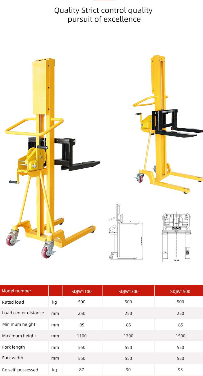 500 کلو گرام ہینڈ پیلیٹ اسٹاکر ہینڈ ڈیوائس کو گھومنے سے ، آپریٹر کارگو کانٹے کو بڑھانے یا کم کرنے کے لئے داخلی مکینیکل ڈھانچے کو چلاتا ہے ، اس طرح اسٹیکر کا اسٹیکنگ آپریشن حاصل کرتا ہے۔
